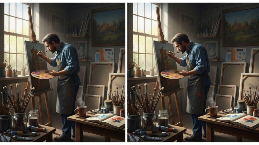 The Painter image has three major differences that are hard to find. These differences are small and easy to miss without careful observation. The first difference appears in the painting or artwork itself. This could involve the color or shape or a tiny detail. The second difference hides in the painter’s clothing or equipment. The third difference typically shows up in the background or image corner. Finding all these differences within 8 seconds tests your observation abilities.